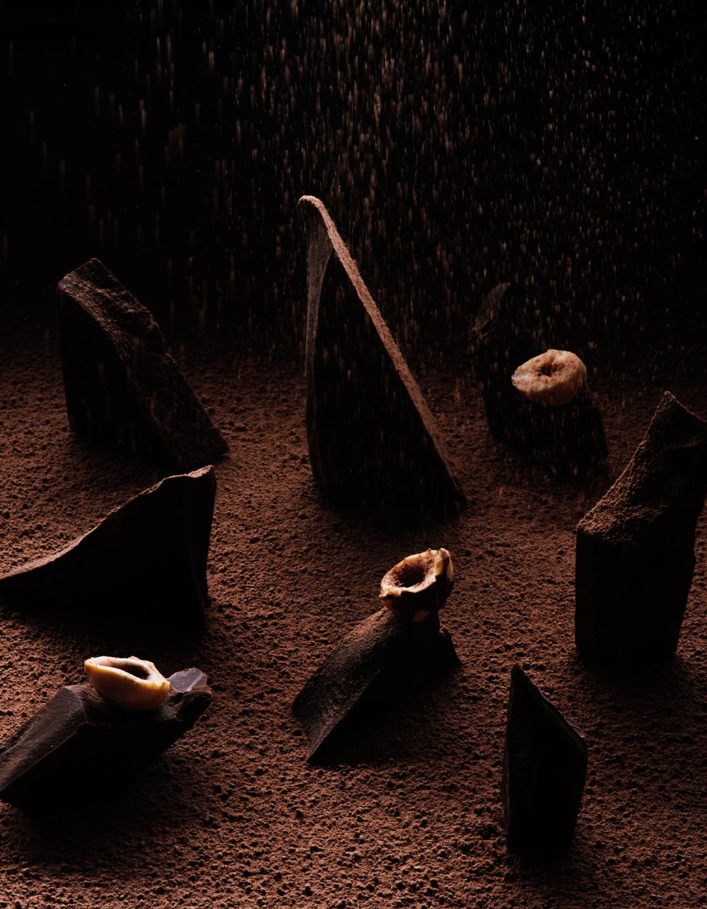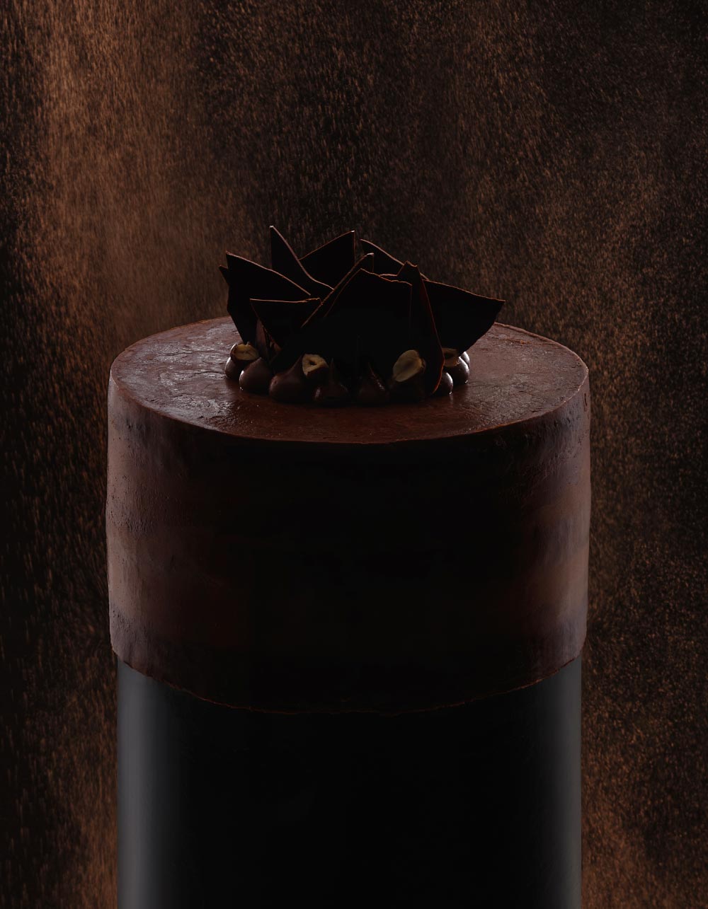 Tre shtresa keku me gjalpë dhe kakao Marou. Mbushur me krem çokollate Marou 75%, ganache Marou 75% e errët, lajthi të pjekura dhe reçel lehtësisht pikant mjedre e xhinxheri. Zbukuruar me copëza çokollate Marou 75%, dhe copëza lajthish.