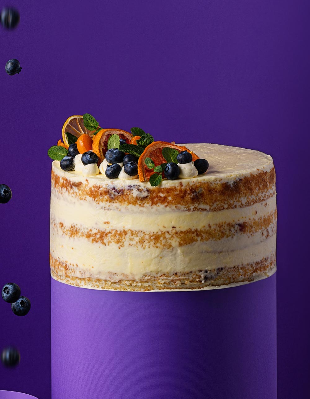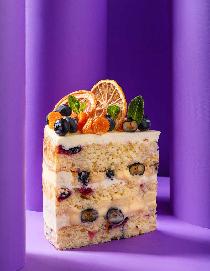 White Velvet me boronica mbushur me krem limoni e boronica, veshur me krem gjalpi me çokollatë të bardhë. Zbukuruar me fruta të thara e boronica të freskëta.